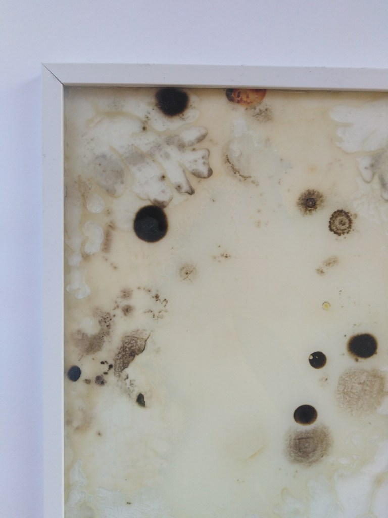 j’expose des cultures de bactéries sous cadre. Mon intervention dans ce travail se cantonnant donc à la préparation du cadre et de la gelée nutritive, mais aussi – détail important – à la récolte d’échantillons. Ces prélèvements de germes viennent de tableaux de maîtres exposés au palais des beaux-arts de Lille, comme Les vieilles de Goya ou La descente de croix de Rubens. J’utilise une matière vivante présente à la surface de ce qui sont pour nous des images fixes inamovibles. Des particules symptomatiques d’une matérialité souvent occultée par l’aspect quasi mythique de ces tableaux. Pourtant c’est, je pense, l’une des raisons de l’admiration que l’on a pour les tableaux, ils sont des images et des objets qui traversant les époques et que des yeux plus vieux que nous de plusieurs siècles ont pu apprécier. Ainsi, les germes couvrant ces tableaux me semblent une métaphore pertinente de cette impalpable admiration que l’on peut ressentir face à des toiles de maître. Je remet alors en mouvement ces objets pour faire, comme dit Michel Blazy, “fleurir” une nouvelle image en espérant que celle-ci conserve un peu de l’aura de mysticisme de sa grande sœur.